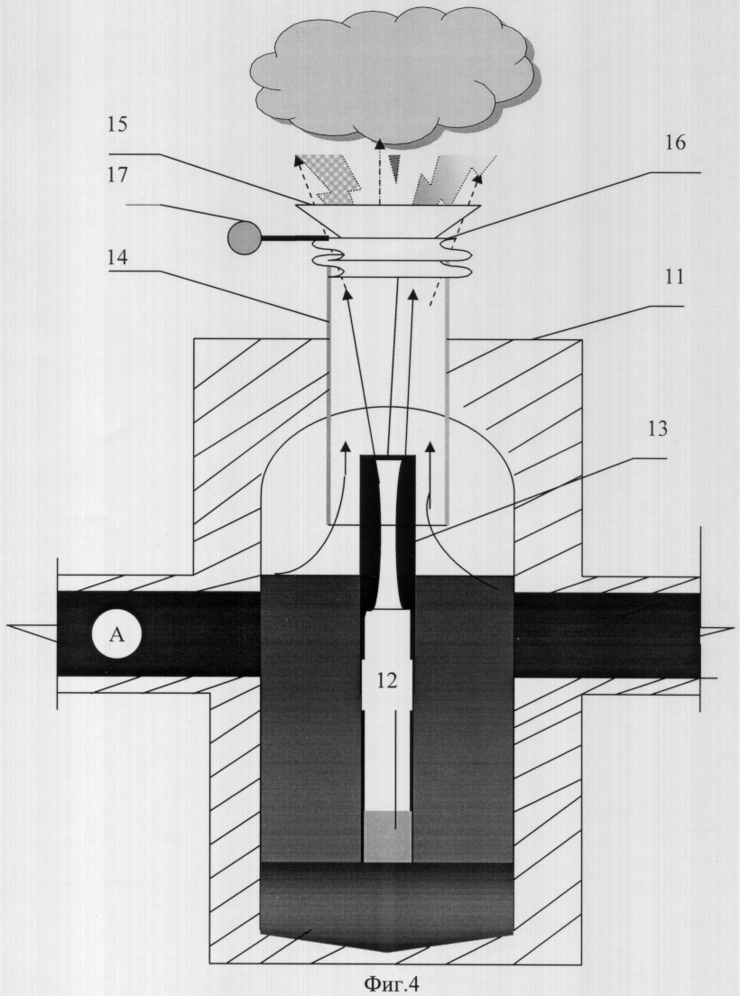 На горизонтальной поверхности одного или нескольких уступов 1, 2, 3 по периметру их внутренних берм размещены трубопроводы 4, 5, 6. Количество уступов, оснащенных трубопроводами, зависит от объема производимых взрывных работ. При этом трубопровод нижележащего уступа соединен с трубопроводом вышележащего уступа посредством скважин 7, образуя гидравлическую систему. Эта гидравлическая система сообщена через канал 8 с дренажной системой 9 карьера (см. фиг.1). На каждом уступе карьера с установленными трубопроводами размещен один или несколько генераторов водяных завес 10, расположенных друг относительно друга на расстоянии, при котором образованные генераторами водяные завесы перекрывают пылегазовое облако (см. фиг.2). Каждый генератор водяной завесы выполнен в виде камеры 11, внутри которой с одной стороны установлен газодинамический генератор 12, а с противоположной – сопло Лаваля 13, коаксиально размещенное в выходной трубе 14 с диффузором 15 камеры (см. фиг.3). При этом внутренняя полость камеры сообщена с внутритрубной полостью А гидравлической системы уступа, на котором находится генератор воздушной завесы. Данная конструкция обеспечивает создание больших секторов водяных завес. Для локальных секторов водяных завес диффузор 15 выходной трубы установлен с возможностью поворота вокруг продольной и поперечной осей камеры посредством, например, гофры 16, фиксируемой в заданном положении с помощью стопорного устройства 17 (см. фиг.4).