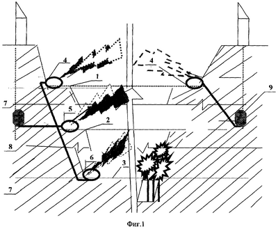 В качестве газодинамического генератора можно использовать пороховые аккумуляторы давления ПАД. Включение генераторов водяных завес осуществляют в соответствии с программой буровзрывных работ посредством инициирования ПАД. Заполнение гидравлической системы водой из дренажной системы карьера производят с помощью насосов, установленных в дренажных выработках (не показаны).