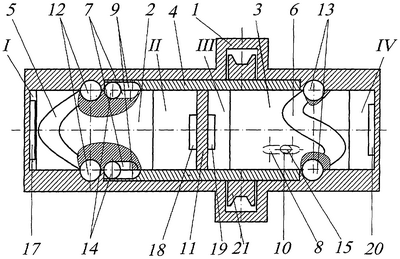 В корпусе 1 и приводном валу 4 выполнены радиальные и продольные каналы 17, 18, 19, 20, обеспечивающие подачу и выталкивание рабочего тела в цилиндры и из них. В совокупности эти каналы образуют золотник, который управляет подачей и вытеснением рабочего тела в цилиндры I; II; III; IV и из них по заданному циклу.