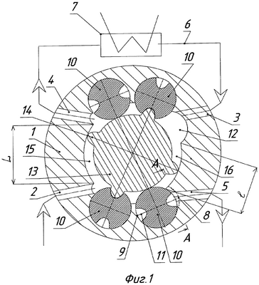 1. Роликолопастной компрессор, содержащий полый корпус с выполненными в нем двумя подводящими каналами рабочей среды, один из которых сообщен с источником рабочей среды, и двумя отводящими каналами рабочей среды, один из которых сообщен с потребителем, а другой сообщен при помощи магистрали со вторым подводящим каналом, разгрузочными пазами, имеющими возможность гидравлического соединения с отводящим каналом, сообщенным с потребителем через паз ролика-разделителя, и с выполненными на его внутренней поверхности выемками под ролики-разделители с пазами и разгрузочной полостью, гидравлически сообщенной со вторым подводящим каналом, при этом в полости корпуса расположен ротор с лопастями, и в поперечном сечении расстояние l между ближайшими точками сопряжения внутренней поверхности корпуса со стенкой разгрузочной полости и выемки под ролик-разделитель меньше расстояния L между ближайшими точками сопряжения внутренней поверхности корпуса со стенкой подводящего канала, сообщенного с потребителем, и со стенкой отводящего канала, сообщенного при помощи магистрали со вторым подводящим каналом.
