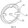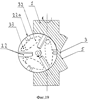На фиг.29 приведен пример конструкции с опорной осью 19а поршня 18, служащей в качестве зуба, для поршней большего размера, которые перекрывают друг другу оси. Каждый конец оси 19а поршня, выступающий в сторону другого поршня, сплюснут. На каждом поршне выполнена канавка 36а такого радиуса, как расстояние между поршнями. В нескольких местах (по количеству вырезов 22 на поршне) между вырезами 22 канавка имеет утолщения 37 по радиусу. Во внешнюю сторону в виде по существу части эллипса, у которого меньшая полуось направлена по радиусу, и к оси поршня в виде по существу части эллипса, у которого большая полуось направлена по радиусу. При прохождении узкой части канавки 36а по сплюснутой части оси относительные скорости велики, не стоит использовать этот участок для удержания оси от вращения, т.е. желательно за счет гарантированного зазора исключить контакт оси 19а с канавкой 36а, но утолщение 37 канавки подходит к оси 19а уже с меньшей скоростью, и, войдя в него, ось 19а начинает поворачиваться (это обеспечивается взаимодействием канавки на этом поршне и сплюснутого участка оси на другом поршне), при этом она тормозит вращение поршня (канавки). Дойдя до центральных по существу круглых участков утолщений 37, сплюснутый участок оси 19а останавливает вращение поршня 18. Далее, выйдя из круглого участка, он снова ускоряет вращение поршня. Когда сплюснутый конец оси 19а поворачивается до положения вдоль канавки. Канавка 36а наезжает на него уже за счет зацепления выреза 22 поршня 18 с разделителем 13 и сплюснутого конца оси 19а другого поршня с канавкой 36а первого поршня.