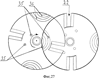 Это можно осуществить, например, в следующей конструкции (см. фиг.27). На одном поршне, вблизи к его оси, напротив выреза 22 расположено два зуба 35. Каждый зуб представляет собой овал (дугу), выступающий вдоль оси поршня. Зубья расположены на разных расстояниях от оси поршня и разнесены по углу. Например, ближний смещен вперед по вращению поршня. На другом поршне ближе к периферии между прорезями 22, на торцевой поверхности расположены две канавки 36 в виде дуг разного радиуса. Их центры совпадают и находятся на расстоянии от оси поршня, как и ось другого поршня. Концы дуг выходят на периферическую поверхность поршня. Первый конец (по ходу вращения поршня) большой дуги отогнут к центру дуг, и второй конец малой дуги отогнут к центру дуг. При вращении поршня его зубья 35 вращаются медленнее, находясь близко к его оси, первый зуб 35 входит в канавку 36 малой дуги в его загнутый конец, еще когда оба поршня сидят вырезами на разделителе 13. Пока зуб 35 одного поршня идет по загнутой (эллиптической) части канавки 36, движение другого поршня, в котором выполнены канавки 36, останавливается. Второй зуб 35 входит в канавку 36 большего радиуса. Далее оба зуба 35 идут по цилиндрическим частям канавок 36, не давая поршню провернуться. Затем, когда первый зуб 35 выходит из канавки 36 меньшего радиуса, второй зуб входит в эллиптическую часть канавки большего радиуса, он проворачивает поршень, выставляя его вырез 22 из прорези вала. Пар таких зубьев и канавок должно быть по числу вырезов 22 на поршнях.
