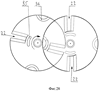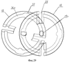 На фиг.28 приведен пример конструкции с меньшим количеством зубьев. На одном поршне, вблизи к его оси, напротив выреза 22 расположен зуб 35, представляющий собой овал (дугу), выступающий вдоль оси поршня. Он может состоять из набора роликов. На другом поршне ближе к периферии между вырезами 22, на торцевой поверхности расположена канавка 36 в виде меньшей части эллипса, вытянутого по радиусу, выходящая двумя концами на периферийную поверхность поршня. При этом ближний к оси поршня участок является по существу цилиндрическим. При вращении поршня его овальный зуб 35 вращается медленнее, находясь близко к его оси, и входит в канал, еще когда оба поршня сидят вырезами на разделителе 13. Пока зуб 35 одного поршня идет по эллиптической части канавки 36, движение поршня, в котором выполнена канавка 36, останавливается (тормозится). Далее зуб идет по цилиндрической части канавки, не давая поршню провернуться за счет части зуба, повторяющей форму цилиндрического участка канавки. Затем, когда зуб выходит в эллиптическую часть канавки, он проворачивает поршень. Таких зубьев и канавок должно быть по числу вырезов 22 на поршнях.