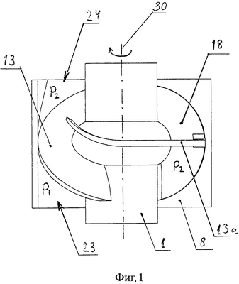 окна входа 23 и выхода 24 рабочего тела, расположенные на корпусе 8 на поверхности 14б, по разные стороны от разделителя 13, прилегая к вершинам этих криволинейных треугольников, окно входа 23 прилегает к разделителю 13 у его начала по ходу вращения вала, а окно выхода прилегает к разделителю 13 у его конца. Окна могут занимать по существу всю поверхность 14б;