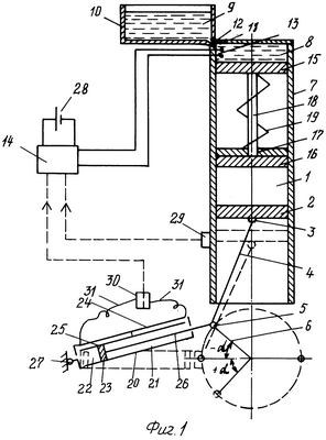 Устройство для пуска дизельного двигателя выполнено следующим образом. Камера внутреннего сгорания 1 (фиг.1) содержит рабочий поршень 2, связанный через шатунную шайбу 3, шатун 4, шатунную шайбу 5 и кривошип 6 с рабочим валом (не показан). Система, создающая первоначальное сжатие, выполнена в виде цилиндра 7, расположенного над камерой внутреннего сгорания 1. В верхней части цилиндра 7 имеется пусковая камера 8, заполненная жидкостью 9. В свою очередь, пусковая камера 8 связана с емкостью 10 шлангом 11, также заполненной той же жидкостью. В шланге 11 имеется электроуправляемый клапан 12. Предполагается использование незамерзающей жидкости, применяемой, например, для смывания лобового стекла автомобиля. Внутрь камеры 8 введены электроды 13, соединенные с системой управления и генерирования импульсов высоковольтного напряжения 14. Электроды 1 и 2 разделены между собой зазором (не обозначен). Пусковая камера отделена от полости цилиндра 7 разделительным поршнем 15. В верхней части камеры сгорания 1 имеется поршень сжатия 16. В крышке (не обозначена) камеры сгорания имеется отверстие 17, снабженное сальником. Разделительный поршень 15 и поршень сжатия 16 жестко соединены между собой стержнем 18 круглого сечения, проходящим через отверстие 17 в верхней крышке камеры сгорания 1. Между верхней поверхностью крышки камеры сгорания и разделительным поршнем 15 установлена пружина сжатия 19. Механизм, передающий движение на рабочий орган, содержит пневматическую пружину 20 в виде цилиндра с воздушными камерами 21 и 22, разделенными поршнем 23. Воздушные камеры через патрубки соединены с воздушными карманами соответственно 24 и 25. Поршень 23 снабжен штоком 26, который шарнирно сочленен с шатунной шейкой 5 кривошипно-шатунного элемента. Цилиндр пневматической пружины 20 на торцевой поверхности, т.е. на стороне, противоположной выходу штока, имеет шарнир 27, с помощью которого он сочленен с неподвижной частью двигателя. Положение поршня 23 в цилиндре пневматической пружины 20 выбрано так, чтобы ее нейтральное положение соответствовало такому состоянию кривошипно-шатунного элемента, когда кривошип 6 располагается перпендикулярно направлению движения рабочего поршня в одном из положений рабочего вала двигателя. На фиг. показано возможное расположение кривошипа 6 при остановке двигателя, который находится в пределах – ÷+ .