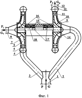 На фиг.1 обозначено: 1 – трубопровод подвода суммарного расхода жидкости (например, воды); 2, 3 – соответственно трубопровод подвода части суммарного расхода жидкости к лопаточному центробежному насосу и к лопаточной центробежной турбине; 4 – коллектор; 5 – сопловой аппарат; 6 – рабочее колесо турбины; 7 – корпус турбины; 8 – трубопровод отвода жидкости от турбины; 9 – рабочее колесо насоса; 10 – корпус насоса; 11 – лопаточный диффузор; 12 – улиточный диффузор; 13 – трубопровод отвода жидкости от насоса; 14 – вал; 15 – подшипники качения; 16 – торцовые уплотнения; 17 – манжетные или сальниковые уплотнения; 18 – отверстие для слива просочившейся жидкости.
