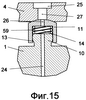 Фиг.15 – вариант исполнения силовой камеры изменяемой длины: один силовой выступ и один вмещающий элемент в виде цилиндра со сферическим торцом и сквозным каналом, опирающийся на опорную часть ротора, содержащую опорную полость и сквозной канал;