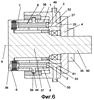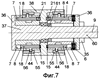 На фиг.7 показан вариант исполнения ротора с двумя рабочими камерами в обеих частях ротора и двумя комплектами шиберов, причем одна из частей ротора выполнена в виде кольцевого элемента. На обеих крышках корпуса, то есть на обеих торцевых поверхностях операционного узла 38 корпуса выполнены ограничители прямого 15 и обратного 21 переноса. В данном случае также определения “рабочая” и “опорная” по отношению частей ротора и крышек корпуса относительны и используются нами для единства терминологии.