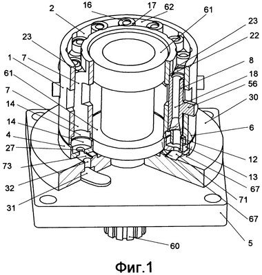 Указанные рабочая и опорная часть ротора установлены на подшипниках 34 на рабочей 3 и опорной 5 крышках корпуса 40 соответственно и соединены с входным валом 60 посредством шарниров 61 таким образом, чтобы вращаться синхронно, но иметь при этом возможность совершать друг относительно друга небольшие осевые перемещения и наклоны, по меньшей мере, достаточные для обеспечения скользящего изолирующего контакта обеих указанных частей ротора с соответствующими крышками корпуса.