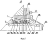 Работает многоступенчатое торцевое уплотнение 12 следующим образом. Газ высокого давления по отводящему каналу высокого давления 40 поступает в каналы высокого давления 26 и 27 ступени высокого давления 14 многоступенчатого торцевого уплотнения 12. Под действием высокого давления газа и пружины 18 кольца, выполненные с возможностью перемещения, расходятся, герметично прижимая по торцу антифрикционные кольца 22 и 23 к корпусу 1 и к выполненному с возможностью перемещения кольцу 17. Одновременно с этим выполненное с возможностью перемещения кольцо 17 с закрепленным в нем антифрикционным кольцом 24 под воздействием тех же сил от пружины 18 и газа высокого давления в каналы высокого давления 26 перемещается в направлении кольца-гребня 19. В полости между кольцом 17 и внутренним диаметром кольца-гребня 19 собирается газ, прорвавшийся сюда через торцевое уплотнение ступени высокого давления 14. Поступая в канавки 20 кольца-гребня 19, газ сжимается и отодвигает кольцо 17 в сторону, противоположную действию сил от ступени высокого давления 14, причем канавки выполняют глубиной L, определяемой из соотношения L (Rконт.-Rвн.), где Rвн. – внутренний радиус кольца ступени бесконтактного уплотнения, Rконт. – радиус соединения кольца ступени высокого давления, выполненного с возможностью осевого перемещения, с корпусом. Глубину канавок L в каждом конкретном случае выбирают в рамках заявленного диапазона из условия, что при вращении ротора 7 результирующая сила от действия всех перечисленных выше сил раскрывала стык газового бесконтактного уплотнения по кольцу-гребню 19 и антифрикционному кольцу, закрепленному в кольце 17. Поступающий из газового уплотнения в канал 35 газ отводится в “свечу”. При этом избыточное давление в канале 35, находящемся непосредственно за газовым уплотнением, поддерживают на уровне 0,02-0,05 ати. Это давление является рабочим для эжектора, отсасывающего из разгрузочного канала 25 прорвавшийся из канала низкого давления сброса в свечу 35 через антифрикционное кольцо 21 газ. Сам эжектор состоит, например, из сопла Вентури 29 с радиальными отверстиями 30, соединенными с каналом 25. Антифрикционное кольцо 21 по торцу прижато к корпусу 1 гайкой 31. В гайке 31 закреплено подпружиненное контактное уплотнение 32, препятствующее вытеканию масла, например, на стоянке. В случае отсутствия необходимости выхода вала за пределы корпуса с одной из сторон вала 9 ступень низкого давления 14 многоступенчатого торцевого уплотнения 12 выполняется в виде крышки 33. При этом поддерживаемая разность давления на стенке крышки в пределах указанной величины 0,02-0,05 ати обеспечивает разгрузку ротора от осевых сил, а подача через отводящий канал высокого давления 40 в многоступенчатое торцевое уплотнение 12 газа высокого давления препятствует потере масла через многоступенчатое торцевое уплотнение 12.