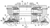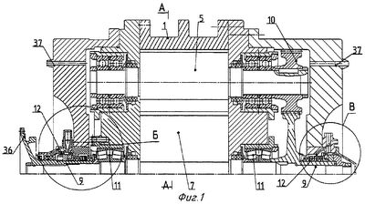 Показаны соответственно: на фиг.7 и 8 – диаметры телескопического соединения подвижного кольца с корпусом и конца спиральной канавки на кольце-гребне, на фиг.5 – канал сброса в “свечу”, 35, на фиг.1 – приводной фланец 36 и каналы подвода масла 37.