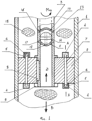 Работает гидравлический демпфер следующим образом. В статике, когда, например, транспортное средство, в котором используются гидравлические демпферы, их детали находятся в таком положении, как это показано на фиг.1. При движении транспортного средства (на чертежах оно не показано) поршень 2 совместно с полым штоком 3 совершает рабочий ход по стрелке В (см. фиг.1), при этом находящаяся в подпоршневой полости рабочая жидкость 18 поступает по стрелке С в горизонтальные каналы 6 выступов 5, проходит через вертикальные каналы 7 и контактирует с радиальными ребрами 4, создавая крутящий момент Мкр на полом штоке, который закручивается на определенный угол, поглощая поступательную энергию хода поршня 2. Обратный ход поршня 2 происходит так же с сопротивлением, но при этом рабочая жидкость протекает по каналам 6 и 7 в противоположном направлении стрелке С. В случае же резкого возникновения динамической нагрузки при рабочем ходе поршня 2 (см. фиг.4), когда его скорость VPX мгновенно возрастает, рабочая жидкость 18 получает движение по стрелке D в полой полости штока 3, проходит через сквозное отверстие 12, выполненное в диафрагме 11, и перемещает с некоторым сопротивлением сферическое тело качения 13 в направлении стрелки Е (за счет наличия круговой лыски 14, выполненной на сферическом теле качения 13, например, по 4-му квалитету образующей с внутренней поверхностью полого штока 3 поступательную кинематическую пару высокой точности сопряжения) до тех пор, пока оно не упрется в диафрагму 10. После этого рабочая жидкость 18 уже не сможет протекать по вертикальному осевому сквозному каналу 15 и поэтому поступит по стрелкам F в нижние конусные каналы 17, истекая из них с значительной скоростью и создавая сопротивление движению поршня 2 по стрелке В (следует отметить, что скорость истекания рабочей жидкости 18 из каналов 17 возрастает за счет того, что на выходе каналы 17 имеют диаметр отверстия меньший, чем на входе. Более того, на чертежах это не показано, но количество каналов 17 может быть различным, исходя из габаритов и области применения гидравлического демпфера). Чем выше скорость VPX движения поршня 2 при рабочем ходе, тем выше будет демпфирующая способность гидравлического демпфера. В то же время в верхние конусные каналы 16 рабочая жидкость попасть не может, так как они прикрыты сферическим телом качения 13. При обратном ходе поршня 2, то есть отдаче демпфера, последний вместе с полым штоком 3 будет перемещаться в направлении, обратном стрелке В со скоростью движения VOX (см. фиг.3), и тогда под действием тока рабочей жидкости 18 по стрелке К сферическое тело качения 13 переместится по стрелке L и последняя поступит в его вертикальный осевой сквозной канал 15 так же по стрелке К и будет транспортироваться в дальнейшем по полому штоку 3 в подпоршневую полость демпфера, так же демпфируя этот вид динамического нагружения. В дальнейшем описанные процессы могут повторяться неоднократно.