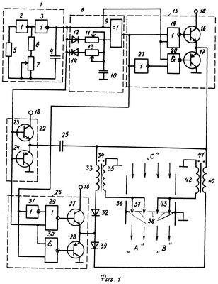 Вернемся вновь к схеме по фиг.1. Здесь первый 22 и второй 26 переключатели образуют мост, в диагональ которого включены последовательно соединенные вольтодобавочный конденсатор 25 и две первичные обмотки: 33 трансформатора 34 и 40 трансформатора 41; вторые концы этих обмоток через встречно включенные диоды, соответственно, 32 и 39 подключены к выходу переключателя 26 либо так, как показано на фиг.1, либо через контактные группы 47 и 48 реле 44 – как это показано на фиг.3. Здесь реле 44 вместе с защитным диодом 45 включено в виде нагрузки таймера 46 между выходом этого таймера и шиной питания 18.