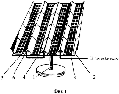 Под боковыми отражателями 4 установлены плоские отражающие элементы 5, которые закреплены вдоль обращенных друг к другу боковых поверхностей солнечных панелей 3.