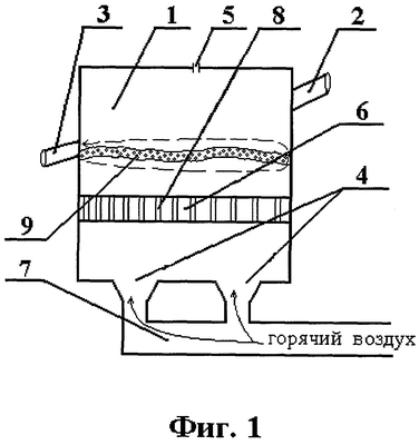 Внутрь рабочей камеры в ее нижней части помещена горизонтально ориентированная перфорированная пластина 6, служащая для того, чтобы создать направленный поток подаваемого в рабочую камеру 1 через отверстия для подвода горячего воздуха 4 горячего воздуха. При практической реализации предложенного устройства в пластине может быть выполнено порядка 9000 отверстий, образующих перфорацию. К отверстиям для подвода горячего воздуха 4 с одного своего конца подсоединен воздуховод 7 для подвода в рабочую камеру 1 горячего воздуха. Другим своим концом воздуховод сопряжен с источником горячего воздуха – теплонагревателем вентиляторного типа (на фиг. не показан).