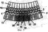 расширения, которые приводят к стабилизирующему сжатию фасонных кирпичей 12, расположенных на внутреннем вогнутом огнеупорном слое 14, в то время как тепловые расширения вызывают расширение внешнего выпуклого огнеупорного слоя 13, что позволяет не использовать нижеследующие меры, предлагаемые в данном изобретении, для предотвращения разрушения структуры жаропрочных фасонных кирпичей 11, описанного выше.