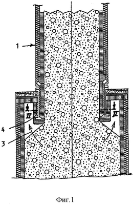 Как известно из многочисленных описаний шахтных печей конструкции «Maerz», приводимых в литературе, две и несколько параллельных друг другу печные шахты 1 в каждом случае имеют один кольцевой канал 2, в который поступают горючие газы в направлении, показанном стрелкой 3, для того чтобы попасть в не изображенную шахту печи и эксплуатируемую регенеративным способом. Таким образом, топочные газы проходят вокруг внутренней цилиндрической стенки 4, ограничивающей внутреннее сечение кольцевого канала 2. При этом температура внутренней стенки при сгорании извести составляет около 1000°С.