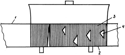 Сущность изобретения поясняется чертежом, на котором показаны корпус 1 части пулеуловителя, тормозной блок 2, в который перед каждым случаем использования устанавливают вертикально пластины резины 3, переложенные бумажными листами 4.
