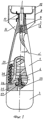 Длина “L” звена 9 от передней кромки перегородки 10 втулки 8 до головки 11 звена 9 превышает длину “m” перегородки 10. Звено 9 жестко крепится к наконечнику 12 линейного заряда 4. Радиальный зазор, с которым в отверстии перегородки 10 втулки 8 размещено звено 9, и длина “L” звена 9 обеспечивают возможность поворота вытяжной втулки 8 относительно заряда 4 при работе вытяжного устройства 5. Диск 7 вытяжного устройства 5 снабжен приливами 13 с пазами 14, в которые входят выступы 15 перьев 16 стабилизатора 2, и поджат пружиной 17 кручения-сжатия. Пружина 17 имеет отогнутые концы, один из которых заходит в отверстие 18 диска 7, а другой опирается на перо 16 стабилизатора 2. Диск 7 с втулкой 8 при сборке устанавливаются в хвостовом отверстии 6 корпуса 1 поджатием пружины 17 и поворотом ее на некоторый угол до совпадения пазов 14 с выступами 15 перьев 16. Этим пружине 17 придается крутящий момент, необходимый для выхода диска 7 из зацепления при работе вытяжного устройства 5.