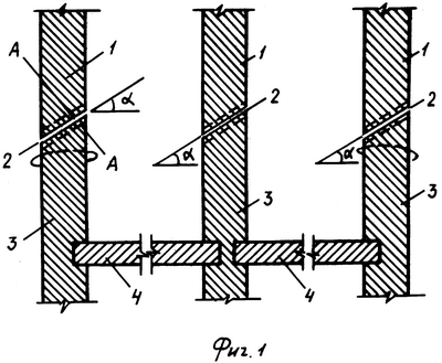Сущность изобретения поясняется чертежом, где на фиг.1 изображен поперечный разрез здания, подлежащего сносу; на фиг.2 – разрез по А-А на фиг.1; на фиг.3 – план угловой части здания; на фиг.4 показаны силы и реакции, действующие при образовании щели и в момент взрыва.