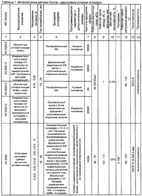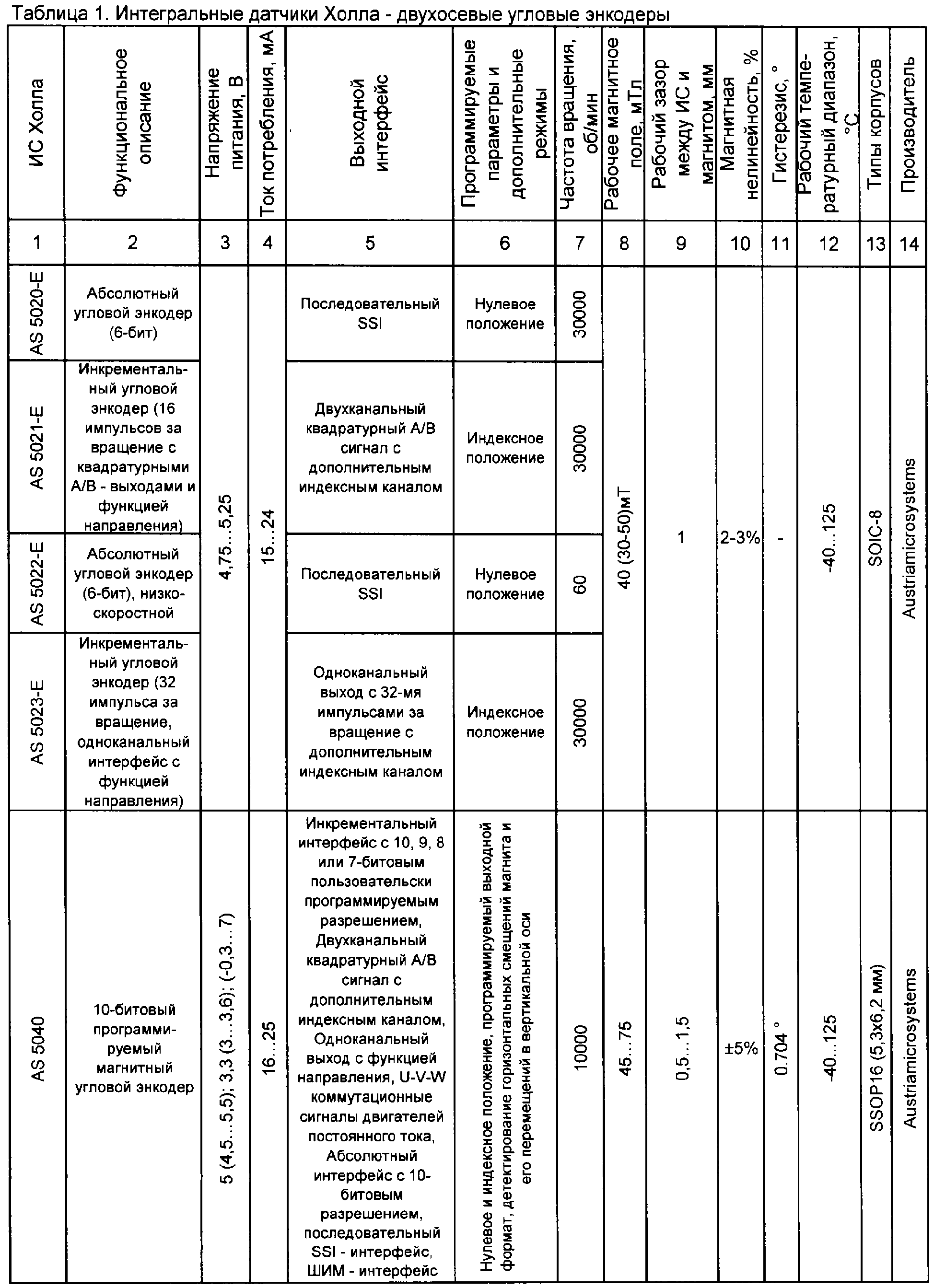 Все технологии подходят для двухосевых аналоговых измерений (с образованием ортогональных синусных и косинусных сигналов) и дополнительно обеспечивают получение информации о направлении магнитного поля при его периодическом изменении, но на момент подачи заявки полностью интегральные решения датчиков – ИС энкодеров (табл.1) – реализованы только на основе технологии планарных элементов Холла.