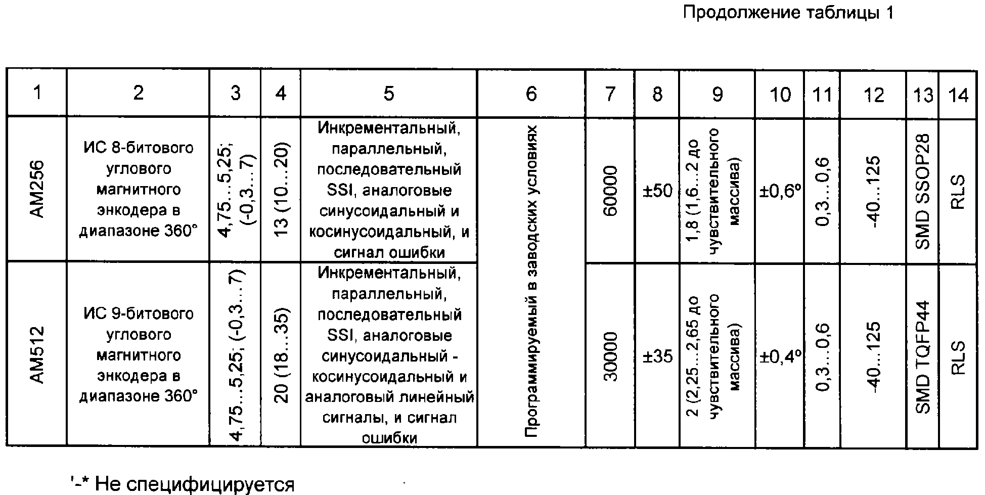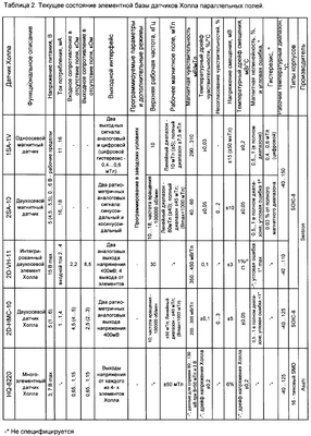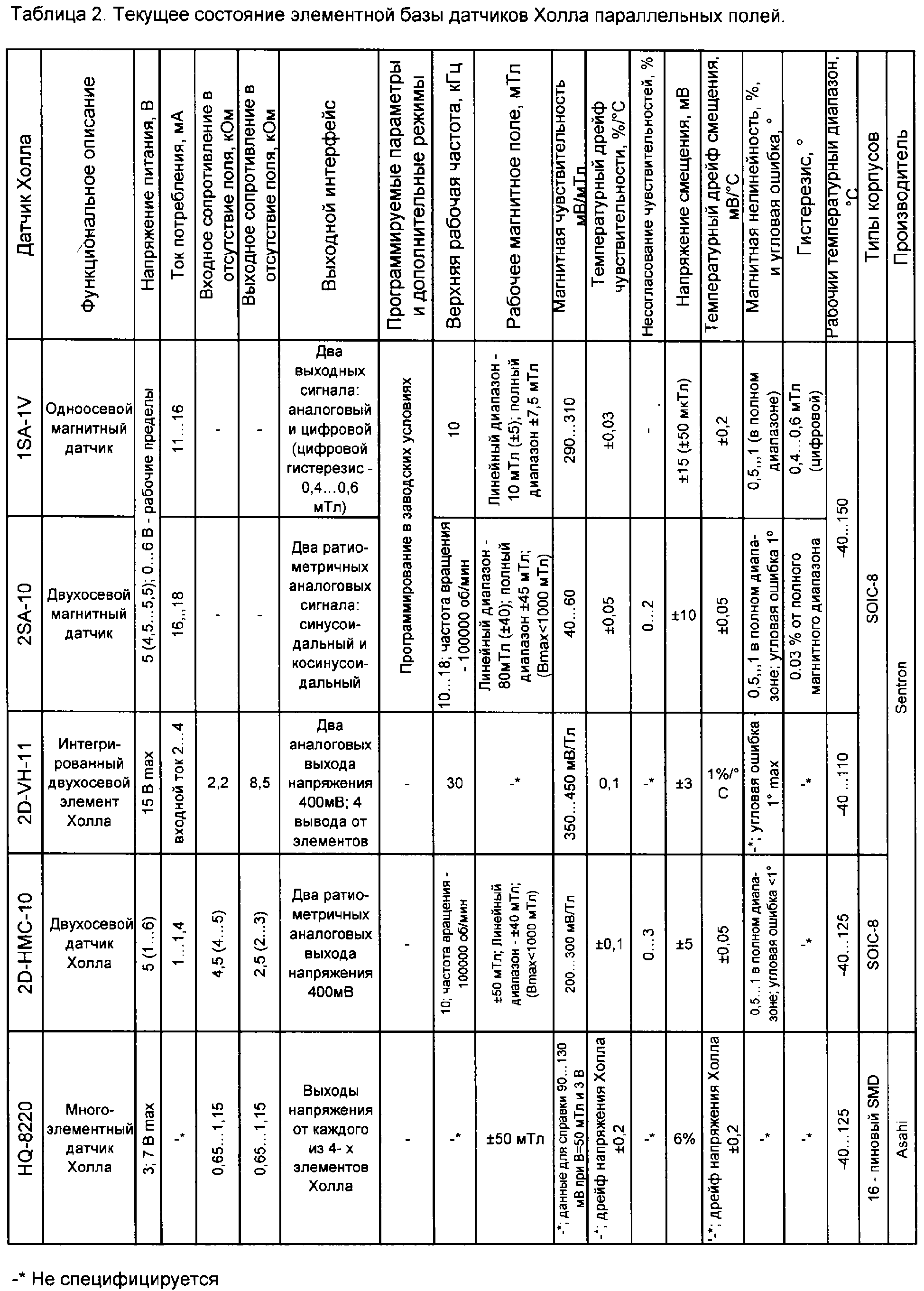 В качестве альтернативы данному устройству в комбинации с вращающимся дипольным магнитом также могут применяться любые датчики параллельных полей с внешней интерфейсной ASIC – интерполятором или АЦП, приведенные в табл.2, за небольшим исключением для ISA-IV, которых для решения аналогичной задачи потребуется два, в ортогональном варианте их размещения на поверхности платы. Датчики, приведенные в табл.2, не рекомендуются к использованию в заявленном устройстве, но приводятся для иллюстрации потенциальных технологических вариантов.