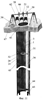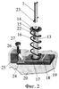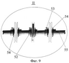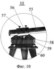 Работа устройства рассмотрена на примере съемки скважин большого диаметра, что принципиально не отличается от съемки вертикальных горных выработок: стволов, шурфов, рудоспусков, очистных полостей, вертикально ориентированных, и др. Так для крепления боковых стенок очистных подземных камер бурят по контуру будущей камеры скважины большого диаметра. Технология проходки таких скважин следующая. Из горной выработки в защитном бетонном слое, сформированном в верхней части очистной камеры, бурится сначала пилотная скважина, диаметром порядка 300 мм, глубиной до 40 м. Затем пробуренная скважина расширяется до большего диаметра (до 600-2000 мм) снизу вверх, при этом расширение производится до нижней границы защитного слоя. В результате, от места перехода с большого диаметра скважины на малый до устья пилотной скважины, остается защитная потолочина 67 (фиг.11), мощностью порядка 1,0-1,5 м. Над устьем пилотной скважины устанавливают штативы 60 с теодолитными подставками 59, в которые вставляют, используя хвостовики 58, трубчатые держатели 56. Затем устанавливают несущую трубку 55 вместе с блоками 50 направляющих тросиков 36 и блоком 51 мерной ленты 12 путем вставки ее в трубчатые держатели 56 с последующей фиксацией винтами держателя 57. Блоки 50 и 51 выполнены с возможностью перемещения вдоль несущей трубки 55, для чего они насажаны на подвижные трубки 52 большего диаметра, чем несущая трубка 55. В свою очередь, сами блоки насажаны на подвижные трубки 52 с возможностью вращения. Перемещению блоков вдоль подвижных трубок 52 препятствуют ограничительные шайбы 54, жестко связанными, например сваркой, с подвижными трубками 52. Перемещая подвижные трубки 52 направляющих блоков 50, добиваются, чтобы точки схода направляющих тросиков 36 с этих блоков проходили вблизи противоположных стенок пилотной скважины и закрепляют выбранное положение винтами 53. Аналогичным образом фиксируют положение блока 51 посередине между блоками 50. Внутренняя поверхность блоков 50 имеет конусообразный профиль для перекатывания по ним направляющих тросиков 36 диаметром 1,5-2,0 мм, а блока 51 – П-образный профиль для перекатывания по нему мерной ленты 12 стандартной ширины (13 мм).