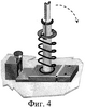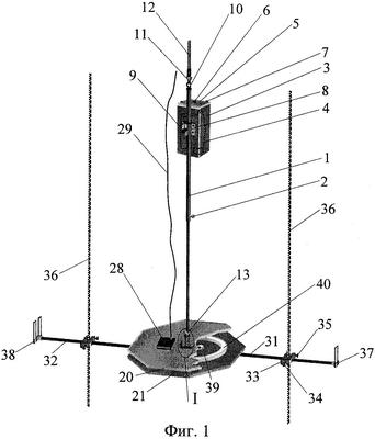 Нажимают на оголовок 27, при этом задвижка 26 выводит пружинную защелку 24 из зацепления с подвижным основанием 17, которое вместе со стыковочным узлом, телескопической штангой 1 и с контейнером 3 поворачивают вокруг шарнира 18 на угол 90° относительно неподвижного основания 19 (фиг.4). После этого задвижку 26 поднимают вверх, освобождая пружинную защелку 24. Стыковочный узел установлен таким образом, чтобы этот поворот осуществлялся в вертикальной плоскости, проходящей через базис. В результате телескопическая штанга 1 расположится вдоль базисной штанги 31 с одинарной маркой 37. Ослабив направляющие тросики 36 и развернув формирователь световой плоскости так, чтобы базисная штанга 32 с двойной маркой 38 оказалась внизу, а базисная штага 31 с одинарной маркой 37 – вверху, заводят формирователь световой плоскости в скважину. После прохода участка скважины с меньшим диаметром формирователь световой плоскости под действием собственного веса и направляющих тросиков 36 поворачивается вокруг шарнира 18 в исходное состояние до взаимодействия подвижного основания 17 с защелкой 24. При этом дополнительно поднимают формирователь световой плоскости до упора его базиса в переходную часть скважины с меньшего на больший диаметр и поворачивают телескопическую штангу 1 пока подвижное основание 17 не войдет в зацепление с защелкой 24.