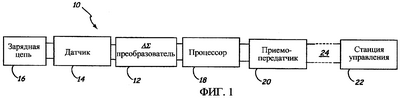Фиг.1 представляет собой блок-схему передатчика 10 управления промышленными процессами, имеющего емкостно-цифровой преобразователь 12, такой как дельта-сигма преобразователь, устроенный для приема сигналов, представляющих давление, от датчика 14. Датчик 14 является дифференциальным датчиком, который включает в себя по меньшей мере пару чувствительных к давлению конденсаторов, заряжаемых зарядной цепью 16. Одним примером датчика 14 является пара датчиков абсолютного давления, как описывается в вышеупомянутом патенте Frick et al. Заряды на этих конденсаторах представляют давление и передаются в преобразователь 12, который преобразует эти заряды в цифровые сигналы. Цифровой сигнал, выходящий из преобразователя 12, обрабатывается процессором 18 и вводится в приемопередатчик 20, который подает стандартизованный сигнал передачи в протоколе, разработанном для передачи в центральную станцию 22 управления по двухпроводной линии 24 связи. Дополнительно станция 22 управления может посылать сигналы к удаленному передатчику 10 управления промышленными процессами по линии 24 связи, которые принимаются через приемопередатчик 20 для обеспечения управления передатчиком 10 известным в уровне техники образом.