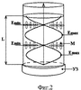 Использование в способе ультразвукового излучения позволяет достоверно судить о качестве моторного масла из-за возможности использования эффекта остаточной вязкости, заключающегося в том, что масла, предварительно нагретые до одной и той же температуры различными способами, после отключения нагревателей остывают и соответственно меняют вязкость различными способами. В маслах, нагретых ультразвуком, вязкость выше, чем в маслах, нагретых до той же температуры термически. Как известно, моторное масло представляет собой базовое масло с добавлением различных высокомолекулярных присадок, которые равномерно распределены по объему масла (фиг.1) [5]. При воздействии на масло ультразвука определенной частоты и интенсивности в зависимости от состава базового масла и природы химических присадок масло нагревается. При этом в нем можно добиться формирования стоячих ультразвуковых волн с выраженными максимумами и минимумами энергии. Образование стоячих волн приводит к перераспределению молекул присадок таким образом, что они начинают концентрироваться в областях с минимумами энергии. То есть в масле, обработанном ультразвуком, возникают области повышения и понижения концентраций распределения молекул. Общая картина распределения ультразвуковых волн в слое масла, обработанного ультразвуком, представлена на фиг.2, где L – толщина слоя масла; Emax – область максимальной энергии; Еmin – область минимальной энергии; УЗ – излучатель ультразвуковых колебаний; М – область концентрации молекул присадок масла.