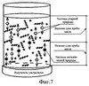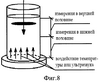 Чем больше срок эксплуатации масла, тем больше в нем механических примесей, в том числе взвешенных частиц металлической (продукты износа деталей ЦПГ) и угарной природы (нерастворимые продукты окисления). При этом частицы угарной природы распределены в слое масла равномерно, а частицы металлической природы как частицы с большей плотностью распределены в основном в нижних слоях пробы масла. При воздействии на диагностируемое масло ультразвуком все частицы начинают двигаться в слое масла и разрушать разветвленную структуру присадок, что влияет на вязкость масла. При этом предполагается, что часть частиц, приблизительно половина, с меньшей плотностью, т.е. частиц угарной природы, передвигается в верхние слои масла. А оставшаяся их часть и частицы с большей плотностью, т.е. металлические частицы, располагаются в нижних слоях масла (фиг.7). Значит, вязкость масла по длине емкости для исследований будет неодинакова. Следовательно, время прохождения чувствительным элементом верхнего и нижнего участка емкости, наполненной испытуемом маслом, будет различным (фиг.8) Сравнивая результаты измерения вязкости масла, нагретого термически и ультразвуком, можно определить фактическое состояние масла, процентное соотношение примесей различного характера, которое в дальнейшем может позволить сделать вывод о правильности работы самого двигателя.