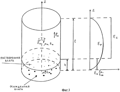 Электрические силовые линии этого колебания начинаются на одной и заканчиваются на другой торцевой стенке: Ez – аксиальная составляющая электрического поля колебания Е010, – деформация электрической силовой линии за счет граничных условий на границе раздела воздух-исследуемая жидкость. Измеряется изменение добротности колебания Е010 ЦОР: ( нагруженная; – ненагруженная добротности ОР с колебанием Е010). Так как электрическое поле колебания Е010 равномерно по длине резонатора, то Q2 будет зависеть как от растворенной влаги, так и от влаги, находящейся в осадке: