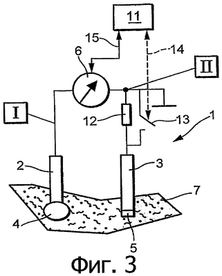 Если на опорной полуячейке 3 с жидким переходом произойдет блокирование, то во время измерения становятся заметными электрические паразитные потенциалы между измерительной 2 и опорной 3 полуячейками. Поскольку измерительная 2 и опорная 3 полуячейки 2, если смотреть с электрической точки зрения, включены последовательно, сумма импедансов доминирует, однако, за счет импеданса измерительной полуячейки 2. Поэтому, как показано на фиг.1, простое измерение сопротивления между точками и не позволяет сделать вывод о фактическом импедансе опорной полуячейки 3.