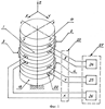 Секция 4, предназначенная для измерения другой поперечной компоненты вибрации, имеет конструкцию, аналогичную секции 3, и повернута на 90° вокруг продольной оси пакета относительно секции 3. С целью получения более высокой чувствительности секции 3 и 4 могут содержать несколько групп аналогичной конструкции, средние пластины 10 которых соединены электрически параллельно.