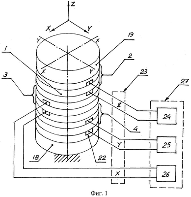 Устройство работает следующим образом. Продольная компонента вибрации в направлении оси Z вызывает в пластине 5 секции 2 механические напряжения и за счет механоэлектрического преобразования энергии – электрический сигнал, который усиливается и регистрируется измерительной системой 27. Поперечная компонента вибрации в направлении оси X вызывает в сегментах 11 и 12 пластины 10 секции 3 механические напряжения противоположных знаков. За счет противоположного направления поляризации в сегментах 11 и 12 электрические сигналы в соединенных параллельно сегментах имеют одинаковый знак. Полученный электрический сигнал усиливается соответствующим усилителем 25. Аналогично работает секция 4 при измерении поперечной компоненты вибрации в направлении оси Y.