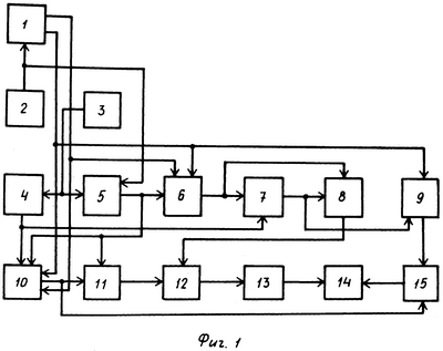 при этом вход и первый и второй выходы блока управления сканированием при попеременном перемещении луча с разными скоростями 1 соответственно соединены: с выходом формирователя импульсов 2, соединенным также с первым входом преобразователя углового рассогласования в код 5, с первым и вторым входами оперативного запоминающего устройства, а третий и четвертый входы и выход которого соответственно соединены: через преобразователь амплитуды в код 4 с выходом приемника 3, с выходом преобразователя углового рассогласования в код 5, с вторым входом вычитателя с контролируемой разностью 11, имеющего первый вход, соединенный с выходом преобразователя углового рассогласования в код 5, второй вход которого соединен с выходом приемника 3, а выход постоянного запоминающего устройства 13 соединен с первым входом вычитателя 14, второй вход которого соединен с выходом блока элементов ИЛИ 15, второй и первый входы которого соответственно соединен с выходом оперативного запоминающего устройства 10 и с выходом блока элементов совпадения 9, первый и второй входы которого соответственно соединены с выходом оперативного запоминающего устройства 7, с вторым входом вычитателя с контролируемой разностью 8 и с третьим входом постоянного запоминающего устройства 6, вторым выходом блока управления сканированием при попеременном перемещении луча с разными скоростями 1, первый выход которого соединен со вторым входом постоянного запоминающего устройства 6, имеющего первый вход и выход соответственно соединенные с выходом преобразователя углового рассогласования в код 5 и с первым входом оперативного запоминающего устройства 7, а выход вычитателя с контролируемой разностью 8 соединен с первым входом блока элементов ИЛИ 12, второй вход и выход которого соответственно соединены с выходом вычитателя с контролируемой разностью 11 и с входом постоянного запоминающего устройства 13.