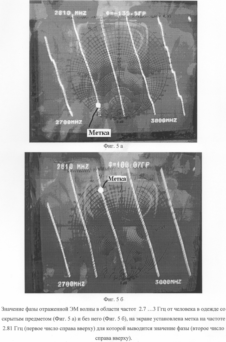 На фиг.5а и 5б приведены фотографии осциллограмм, показывающие значение фазы отраженной электромагнитной волны в области частот 2,7-3 ГГц для человека со скрытым предметом и без него.