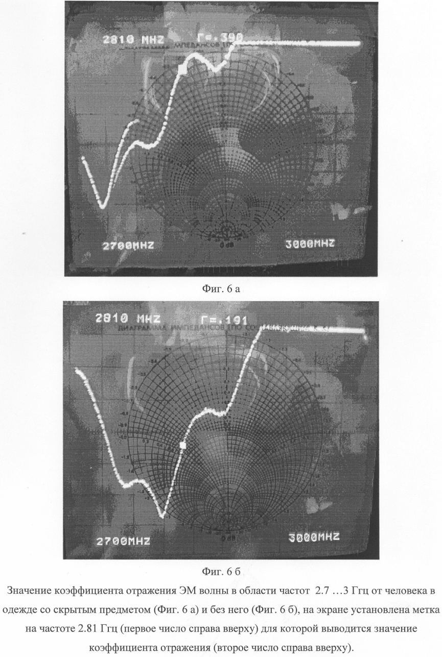 Была проведена серия опытов с полуоткрытым резонатором при регистрации коэффициента отражения и фазы в области частот около 3 ГГц. Наблюдались существенные качественные и количественные различия отраженных сигналов в случае наличия и отсутствия образца моделирующего пластиковую взрывчатку. На фиг.5а приведены данные измерения фазы отраженного сигнала от человека, под одеждой которого имеется образец, моделирующий пластиковую взрывчатку, а на фиг.5б – без образца. Результаты измерения коэффициента отражения электромагнитной волны от человека с образцом представлены на фиг.6а и без него – на фиг.6б. Изменение фазы отраженного сигнала составляет почти радиан, а модуля коэффициента отражения – десятки процентов.