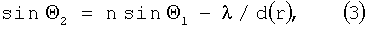 Сопоставление приведенных выше уравнений (2) и (4) показывает, что условие (4) Брэгга удовлетворяется в представленной на фиг.1 геометрии только приблизительно. Аппроксимация строго достоверна в том случае, когда sin 2 tg 1, a sin 2 tg 2 (т.е. ошибка имеет место главным образом при больших углах падения). Однако, чтобы решетка функционировала с высокой эффективностью, в соблюдении строгой достоверности условия Брэгга нет необходимости (см. приведенную выше публикацию Е.Noponen, J.Turunen). Кроме того, можно слегка отклониться от формирования изображения с геометрией 1:1 таким образом, чтобы условие Брэгга в оптимальной степени удовлетворялось при угле падения max, внутри которого распределение интенсивности достигает своих наивысших значений.