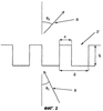 На фиг.2 представлена типичная дифракционная структура типа решетки (находящаяся на поверхностях, изображенных на фиг.1, 3 и 4), которая модифицирована согласно условию Брэгга. Углы 1 и 2 те же, что и на фиг.1, d по-прежнему представляет собой локальный период решетки, с и h характеризуют соответственно ширину и высоту рельефного выступа. Если условия Брэгга