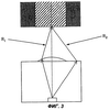 В принципе, показанную на фиг.1 линзу можно модифицировать, обеспечив в центральной зоне наличие преломляющей линзы. При этом дифракционную линзу применяют только при углах падения выше 30 градусов, при которых решетка Брэгга имеет высокую эффективность. Такая структура проиллюстрирована на фиг.3, причем пучки R1 и R2 проходят соответственно через преломляющую и дифракционную поверхности. Такое техническое решение целесообразно использовать в случае светодиода с резонансной полостью (СД-РП). Гораздо менее оно пригодно для лазера, т.к. наличие границы между преломляющей и дифракционной секциями вызывает возмущение пространственно когерентного поля.