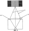 На фиг.4 показана ситуация для геометрии формирования изображения, существенно отличающейся от варианта 1:1 (т.е. волоконный световод удален еще дальше от линзы, в результате чего появляется возможность ввести свет внутрь волокна, имеющего меньшую числовую апертуру). На этой иллюстрации гибридная линза имеет собственную преломляющую поверхность II, снабженную дифракционной структурой. Причина использования гибридной конструкции заключается в том, что в данном случае угол 2 для зоны II меньше, чем на фиг.1, однако, чтобы получить высокую эффективность, условие Брэгга все еще должно удовлетворяться. Для этого бинарную структуру, показанную на фиг.2, формируют на надлежащим образом изогнутой поверхности, т.е. геометрия выбирается таким образом, чтобы выступы рельефа решетки Брэгга имели боковые стенки, локально перпендикулярные (ортогональные) изогнутой поверхности.