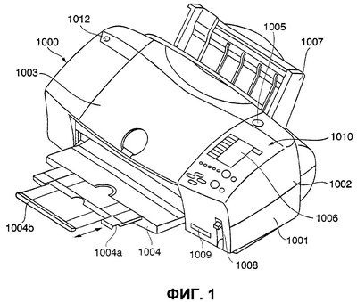 Главный корпус, который формирует корпус ПФП-принтера 1000, имеет кожух М 1000, верхний кожух 1002, крышку 1003 доступа и выходной поддон 1004 в качестве внешних элементов. Нижний кожух 1001 по существу формирует нижнюю половину ПФП-принтера 1000, верхний кожух 1002 по существу формирует верхнюю половину главного корпуса. Эти кожухи совместно образуют полую конструкцию, вмещающую в себе механизмы, описываемые ниже. Отверстия, соответственно, сформированы на верхней и передней поверхностях главного корпуса. Одна концевая часть выходного поддона 1004 закреплена, с возможностью ее поворота, в нижнем кожухе 1001, и поворот поддона 1004 открывает/закрывает отверстия, сформированные на передней поверхности нижнего кожуха 1001. Поэтому, когда принтер получает команду печати, выходной поддон 1004 поворачивается по отношению к передней поверхности, чтобы открыть отверстие и чтобы напечатанные листы смогли выходить из отверстия. Выходящие напечатанные листы поочередно укладываются стопкой на выходном поддоне 1004. Выходной поддон 1004 содержит два вспомогательных поддона 1004а и 1004b. При выдвижении этих дополнительных поддонов, при необходимости, можно в три этапа увеличить/уменьшить площадь загрузки печатных листов.