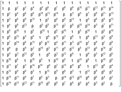 Известно что в расширенном поле GF(р ), состоящем из p элементов, содержится хотя бы один элемент, который является делителем р -1. Для поля GF(24) таким элементом является число 15. Тогда матрица поворачивающих коэффициентов для вычисления спектра комбинации A(z) на основе реализации выражения (4) имеет размер 15×15.
