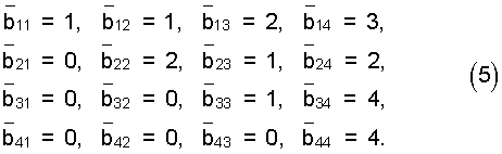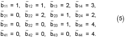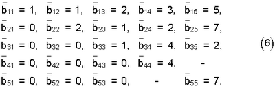 Пример 3. Пусть задана система оснований (модулей) СОК р1=2, р2=3, р3=5. Расширим систему оснований, добавляя р4=7, р5=11. Тогда в выражение (5) добавляется еще один столбец и одна строка, а именно