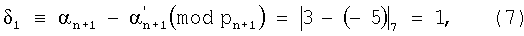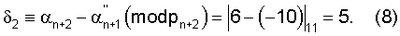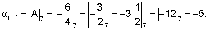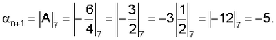 После сложения цифр по модулю pi получим А=[1, 2, 1, 5+4|A|7], но так как 4=|5+4·|А|7|7, но по условию 4=0, т.е. 4·|А|7=-5 или . Мультипликативная обратная величина , и так как число 5 отрицательное, возьмем его дополнение по модулю 7. Итак, вычет числа А по модулю 7 определяется выражением |А|7=2·(7-5)=4.