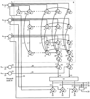 На чертеже приведена нейронная сеть для обнаружения, локализации и исправления ошибок в системе остаточных классов. Нейронная сеть состоит из входного слоя нейронов 2, 23, входного слоя 24, предназначенного для хранения остатков числа по рабочим и контрольным основаниям в течение времени обнаружения ошибки, вход которой соединен со входами 1( 1, 2,…, n) и входами 25( n+1, n+2) нейронной сети; нейронной сети 8, предназначенной для вычисления остатков чисел по контрольным основаниям, входы которой соединены с выходами нейронов 2, хранящими остатки по рабочим основаниям; нейронных сетей конечного кольца 10, 11, предназначенных для вычисления синдромов ошибки по контрольным основаниям, первые входы которых соединены соответственно с выходами нейронной сети вычисления остатков по контрольным основаниям, а вторые – соответственно с выходами нейронов 23, хранящие остатки по контрольным основаниям, входы которых подключены к шине 25; блок памяти 14, предназначенный для хранения констант, вход которого соединен с выходами нейронных сетей конечного кольца 10, 11; нейронных сетей конечного кольца 21, предназначенных для получения исправленного числа путем суммирования неправильного числа с константой ошибки, первые входы которых соединены соответственно с выходами блока памяти, шины 15, которые являются выходными шинами 16, 17 и 18, формирующие номера неисправных модулей и входом элемента ИЛИ 19, выход 20 которого формирует сигнал “есть ошибка”, а вторые – с выходами нейронов 2, а выходные сигналы 22 нейронных сетей конечного кольца 21 являются выходами нейронной сети исправления ошибок.