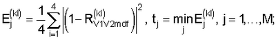 Затем находят минимальное значение расстояния – минимум СКО между величинами коэффициентов корреляции восстановленного блока изображения и максимальным значением коэффициента корреляции с соседними блоками, непригодными для встраивания ЦВЗ и не включенных в массив анализируемых блоков. Минимум СКО определяется по формуле [2]:
