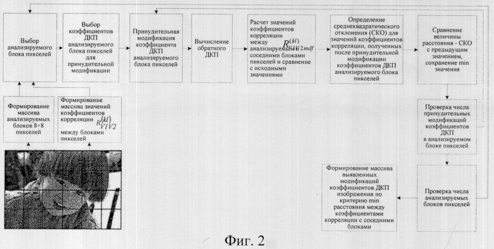 Заявленный способ, схема которого представлена на фиг.2, состоит из этапа формирования массива анализируемых блоков 8×8 пикселей и этапа формирования массива значений коэффициентов корреляции между блоками пикселей, соединенных с этапом выбора анализируемого блока пикселей, который соединен с этапом выбора коэффициентов ДКП анализируемого блока пикселей для принудительной модификации, соединенного с этапом принудительной модификации коэффициента ДКП анализируемого блока пикселей, соединенного с этапом вычисления обратного ДКП, который соединен с этапом расчета значений коэффициентов корреляции между анализируемым и соседними блоками пикселей и сравнения с исходными значениями, соединенного с этапом определения СКО для значений коэффициентов корреляции, полученных после принудительной модификации коэффициентов ДКП анализируемого блока пикселей, который соединен с этапом сравнения величины расстояния – СКО с предыдущим значением и сохранением минимального значения, соединенного с этапом проверки числа принудительных модификаций коэффициентов ДКП в анализируемом блоке пикселей и соединенного обратной связью с этапом принудительной модификации коэффициента ДКП анализируемого блока пикселей, который соединен с этапом проверки числа анализируемых блоков пикселей и соединенного обратной связью с этапом выбора анализируемого блока пикселей, соединенного с этапом формирования массива выявленных модификаций коэффициентов ДКП изображения по критерию минимума расстояния между коэффициентами корреляции с соседними блоками.
