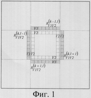 где V1 и V2 – граничные вектора пикселей (Фиг.1). Для каждого блока по его периметру определяют по четыре значения коэффициента корреляции.